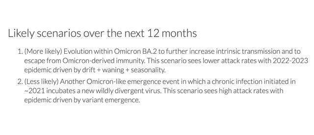 或者说新冠病毒已经找到了最适应人类社会的生存模式。短期内(Trevor Bedford 预测奥密克戎的流行期会是1年半到10年半)不会出现那些我们担心的不可控突变,不至于有致病性的明显波动,而只是一些逃避免疫的微调。也就是奥密克戎之后,下一个会被希腊字母命名的大变异不会轻易来了。