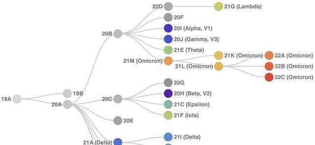 图片中的 21K 是奥密克戎原始毒株 BA.1,21 L 是 BA.2。22A 是 BA.4,22B 是 BA.5,22C 就是今天新闻的主角 BA.2.12.1。它们都是奥密克戎基础上的新变异。