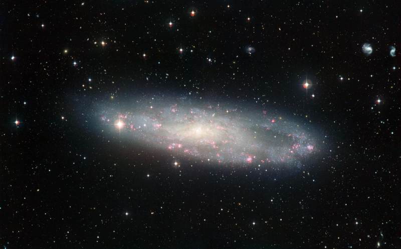 这张关于螺旋星系NGC 247的照片是用ESO在智利La Silla天文台的宽场成像仪(WFI)拍摄的。NGC 247被认为位于1100万光年之外的鲸鱼座中,它是离银河系最近的星系之一。
