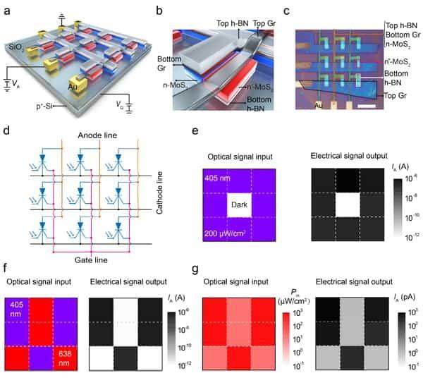 光电存储器阵列应用示例。a. 无选通器的3×3光电存储阵列;b. 局域放大图像;c. 制作完成的器件阵列;d. 等效电路图;e. 无串扰功能验证;f. 波长依赖关系验证;g. 功率依赖关系验证。