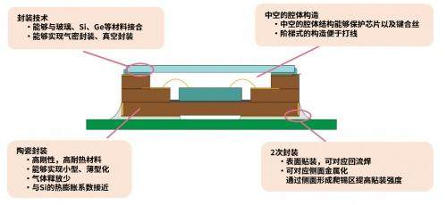 陶瓷封装除了可以实现小型化·薄型化,在高温环境下气体释放少的特点外,还具有高耐热性、高刚性、接近Si的热膨胀系数,有助于实现高可靠性。