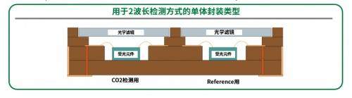 受光元件大多使用光电二极管(PD)、热敏电阻、热管、热电传感器等,通过使用陶瓷封装,可以实现有机封装难以实现的气密封装,还可以应对真空封装,从而可以提高红外线传感器的灵敏度。另外,由于陶瓷封装为叠层工艺制造,易于形成三维结构,可以实现滤光片嵌入的中空腔(台阶),对于2波长检测方式,可以将Reference用的受光元件和CO2 检测用的受光元件封装于同1个管壳内。