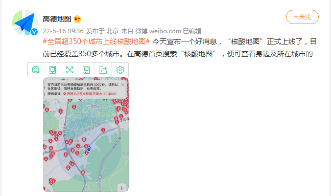 5月16日,@高德地图 官微宣布“核酸地图”正式上线,目前已经覆盖350多个城市。