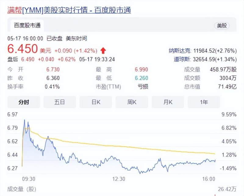 昔日美股上市时,满帮首日收涨超13%,市值升至233亿美元(约合1585亿人民币),而如今截至2022年5月17日收盘,满帮报6.450美元每股,市值为71.49亿元,缩水了三分之二。