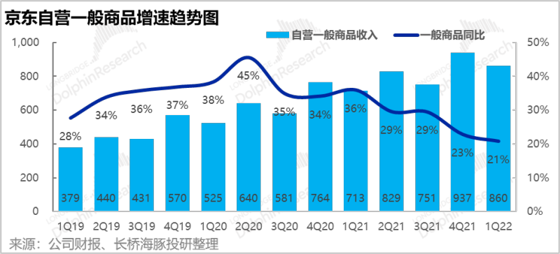 b. 一般商品本季收入达860亿,同比增长21%,基本与市场预期一致。要注意的是,这个板块在上一轮武汉疫情当中,京东靠着手里有货、有仓、有配的一条龙服务,一般商品是疫情当中反而加速增长。