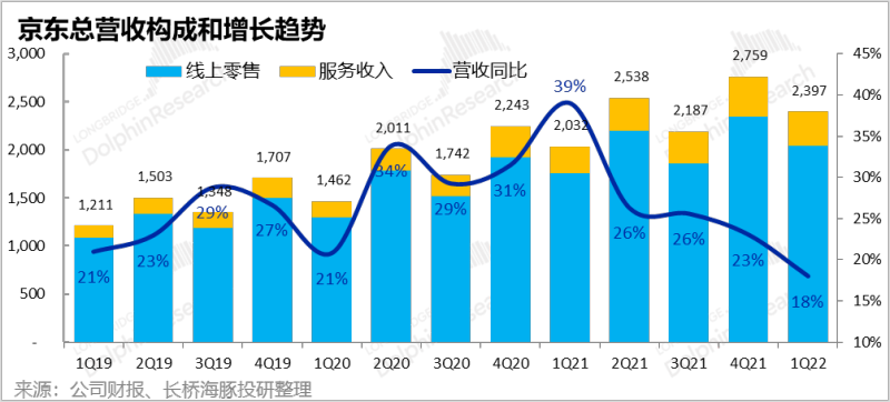 海豚君倾向于认为,剔除这个因素京东在收入端的表现依旧可圈可点,因为a.这两个因素京东已经跟市场充分沟通过,市场是有提前预期的;b.这两项新并表业务主要在服务收入中,而京东这个季度单看商品收入也不弱: