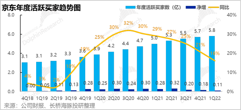 截至2022年一季度末,公司年活跃用户数达5.8亿人,比市场预期的少了300万。考虑到这个春节,京东还罕见赞助了春晚,但对用户数的增长似乎并没有什么用处。