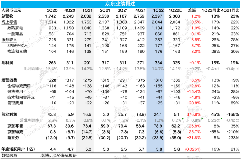 (1)收入端的小超预期,海豚君判断是上海疫情之前京东零售业务表现超市场预期,因一季度无论时自营零售还是代表第三方零售的佣金和广告收入表现都很好,而疫情中一般3P模式的收入大概率塌方。