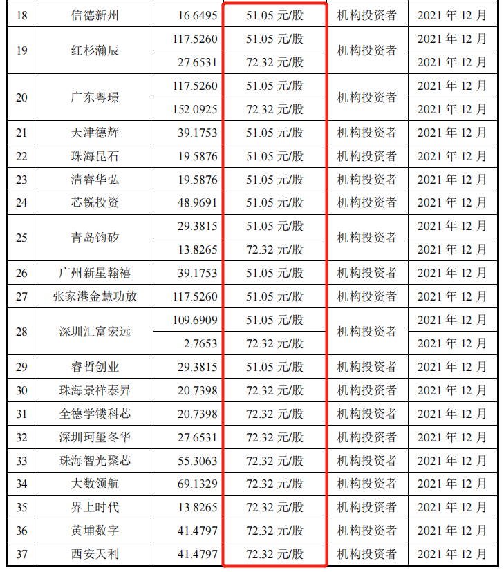 招股书显示,2021年10月的C轮融资时,慧智微的增资价格为51.05元/股。但到了2021年11月的C+轮融资时,慧智微的增资价格则增至72.32元/股。