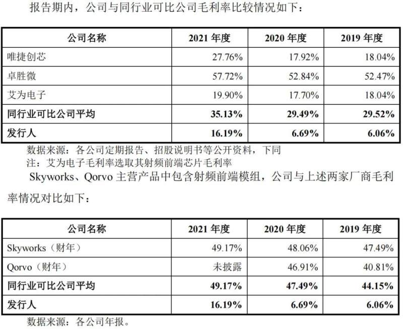 招股书显示,2021年国内同行业可比公司平均毛利率为35.13%,国外公司平均毛利率则达49.17%,均远高于慧智微。