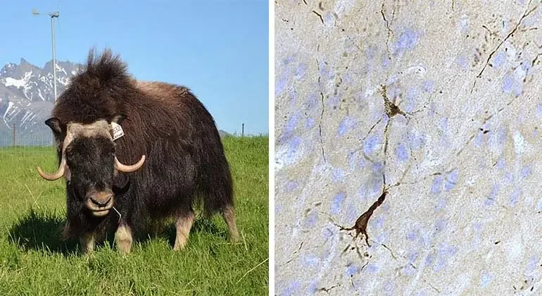 该团队获得了三只死亡的麝香牛和四只大角羊的大脑,他们的初步分析没有发现任何意外,扫描显示每只动物的大脑结构都很完整。然后,大脑被切成片状,并用抗体处理,这些抗体显示出一种叫做 tau 的蛋白质的磷酸化形式,这种蛋白质经常出现在创伤性脑损伤和阿尔茨海默氏病患者的大脑中。