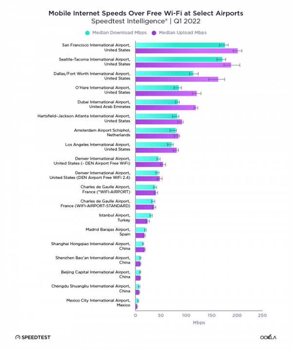 旧金山国际机场在2022年第一季度的中位下载速度为176.25 Mbps,西雅图-塔科马国际机场下载速度的中位数为171.01 Mbps,达拉斯-沃思堡国际机场和芝加哥奥黑尔国际机场分别为113.64 Mbps和85.49 Mbps。