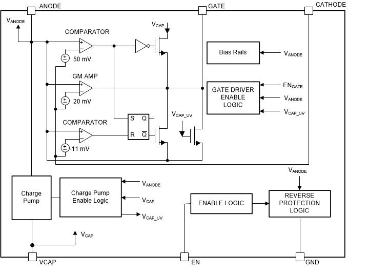该器件控制 MOSFET 的 GATE,将正向压降调节为 20 mV。该调节方案可在反向电流事件期间平稳关闭 MOSFET,并确保零直流反向电流流动。对反向电流阻断的快速响应 (< 0.75 μs) 使该器件适用于在 ISO7637 脉冲测试以及电源故障和输入微短路条件下具有输出电压保持要求的系统。