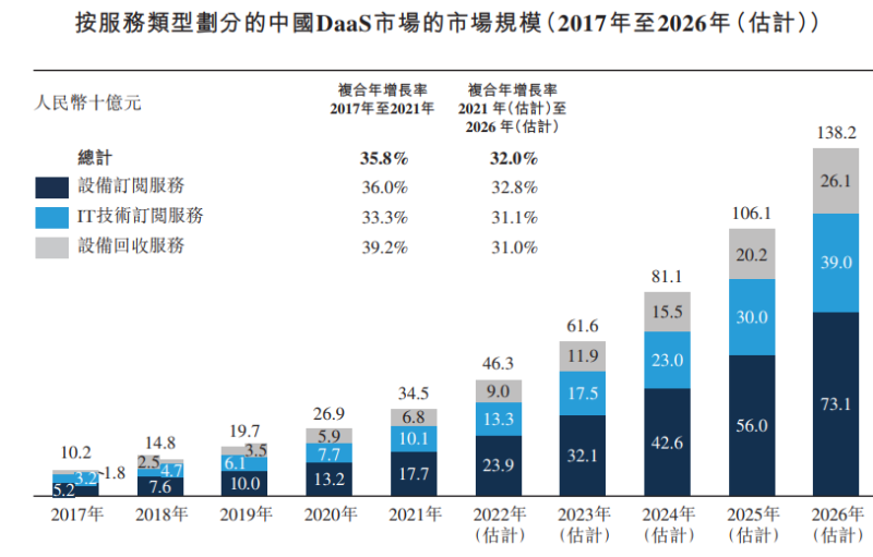 灼识咨询资料显示,尽管我国的DaaS行业仍处于早期的发展阶段,但作为一种新兴的行业趋势,DaaS行业在过去五年中取得令人瞩目的增长。2017-2021年,中国的DaaS市场规模从102亿元增至345亿元;预计2021年至2026年五年间,市场规模将以32.0%的复合年增长率增长至1382亿元。