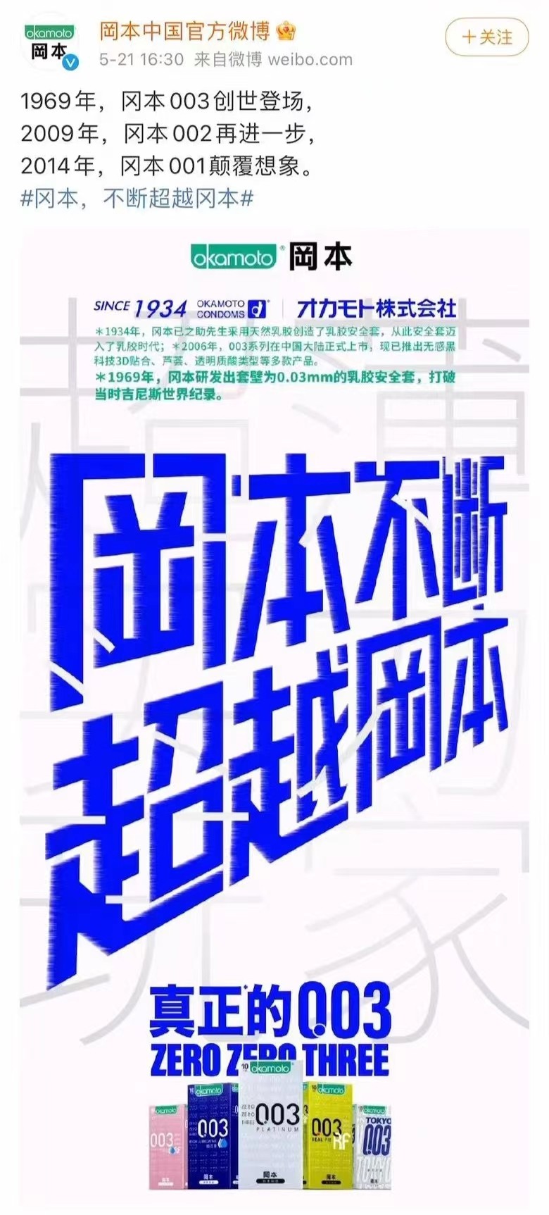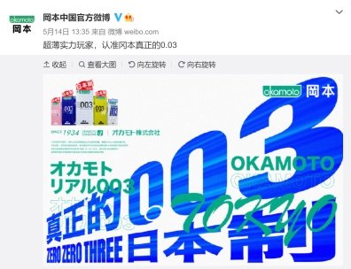 520期间,冈本官方微博先后两次发布主题海报——“冈本真正的0.03”、“冈本不断超越冈本”。与其他安全套品牌一副“浓情蜜意”不同,冈本的海报显得异常“硬核”。