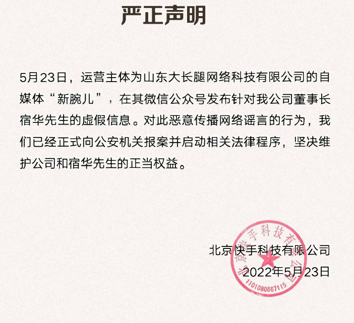 随后,快手方面发布声明称,对此恶意传播网络谣言的行为,快手已经正式向公安机关报案并启动相关法律程序,坚决维护公司和宿华先生的正当权益。