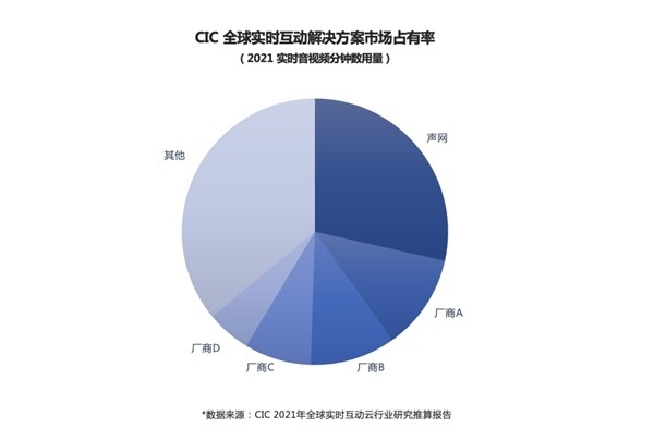 根据独立第三方行业研究与分析机构 CIC 灼识咨询发布的《2021 年全球实时互动云(RTE-PaaS)行业研究报告》(以下简称“报告”)显示,作为实时互动云服务行业开创者和引领者,声网继续蝉联全球实时互动解决方案市场份额第一,根据 2021 年实时互动解决方案支持的实时互动音视频分钟数及年度营收两个指标计算,声网的全球市场占有率均遥遥领先其他服务商。