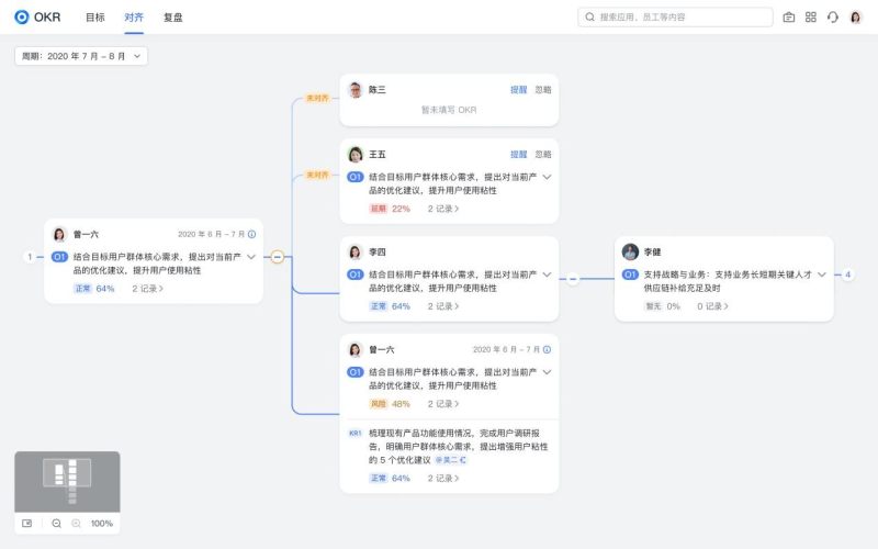 在飞书OKR 中,管理者能清晰地看到战略如何层层落地,最核心的目标由哪些员工来承接,以及哪些人在拆解目标中驱动着创新。