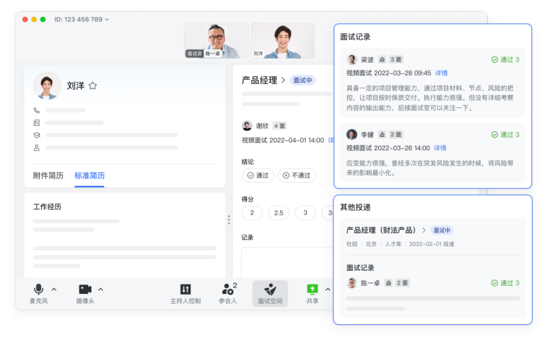 此外,飞书招聘还与飞书Office有着良好的适配与打通,通过日历即可预订面试官时间,点击飞书招聘推送即可进入视频面试,面试官也可以边面试边评价,并随时一键拉取候选人跟进群,追踪候选人面试进度,不用在多个系统中来回跳转。