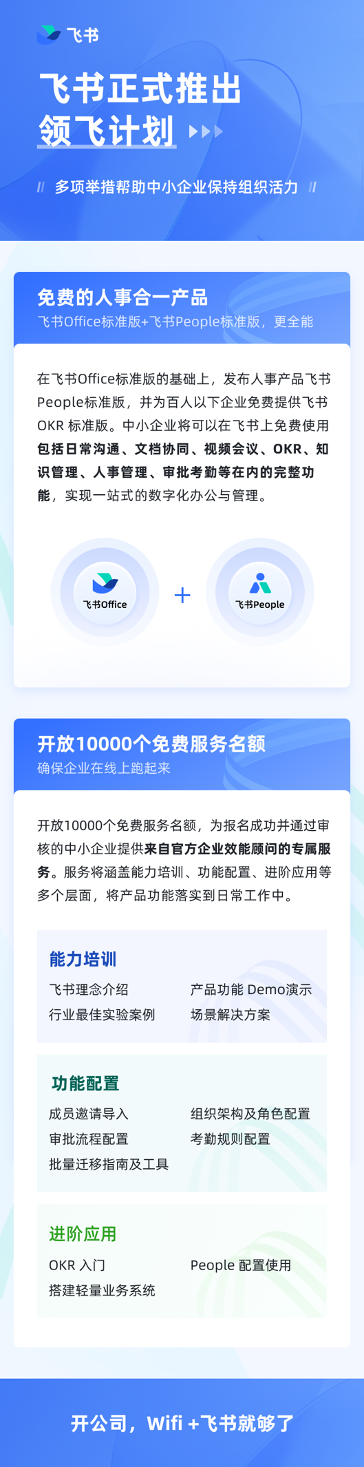 5月25日,飞书举行春季未来无限大会,飞书首席商业官林婵宣布推出“领飞计划”。该计划包含了一揽子中小企业扶持方案,飞书将为中小企业免费提供“人事合一”的飞书Office标准版与飞书People标准版。同时,飞书还将为中小企业提供一万个免费企业效能顾问服务名额,帮助企业落地更好的数字化办公方案,从产品和服务两个维度全面助力中小企业应对挑战。