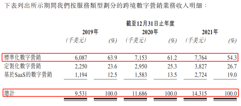 2019年至2021年期间,标准化数字营销占比相对较多高,分别为63.9%、61.2%、54.3%;对应单项营收为6087千美元、7153千美元、7764千美元。占比虽然逐年降低,单项营收却稳步增长。从侧面可以看出整体营收增长将更为可观。