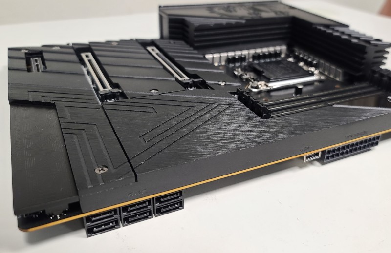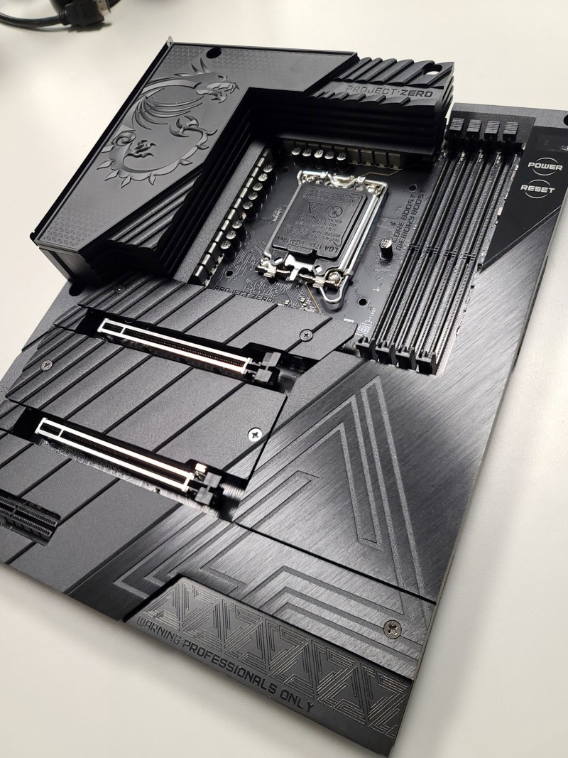 这是一块概念主板,基于Intel Z690平台,应该是来自MEG Z690 UNIFY,除了处理器插座、四条内存插槽、三条PCIe插槽之外,全部覆盖起来,一个接口、元件都没有。