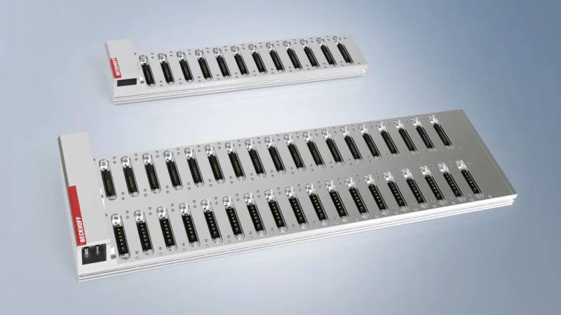 底板有不同的版本可供选择。紧凑型控制解决方案可以通过高度仅为 110 毫米的带有功能模块数据接口的 1 排版本底板接入主电源来实现。所需的 24 V 电源和工业 PC 都包含在功能模块中。2 排版本的底板包括数据接口和底层电源接口。倍福将推出更多的底板版本,比如排内混合各种接口的版本,以及可以布置为三排的扩展版本,用于插接性能更强大的驱动模块。