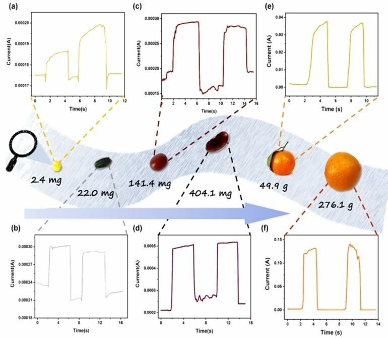 鉴于褶皱MXene薄膜表面的特殊微观结构和出色的传感性能,研究人员进一步分析了其检测特定物体的潜力。研究发现,即使将微小的物体放在基于褶皱MXene薄膜的柔性压力传感器上,也能检测到相对稳定的信号,物体越重,输出信号越明显。有趣的是,当物体表面光滑时,输出信号呈现出弧形,这是由于被研究物体与传感器的不稳定接触引起的。这表明该压力传感器具有检测物体动态运动的能力,在精密微量仪器振动监测中显示出一定的潜力。