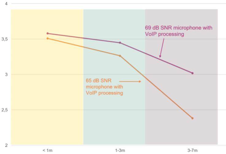 英飞凌研究团队还针对以下三种场景进行了测试,每种场景下,高信噪比的麦克风都表现出了更优越的性能。在近距离场景中,扬声器与设备距离小于1m时,高信噪比的麦克风可以带来更高的通话质量,既不需要使用耳机,也不会出现“声音听起来很远”的效果。