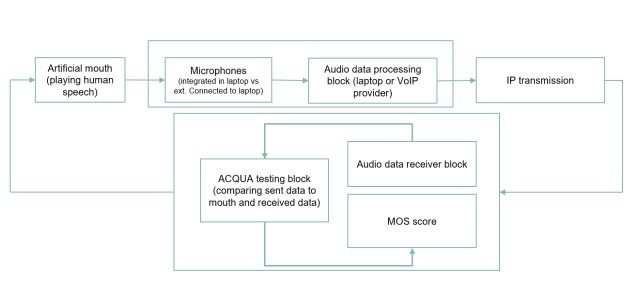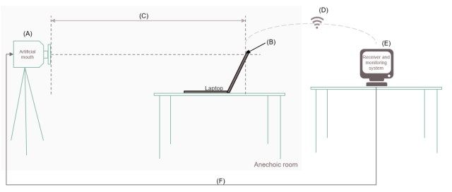 POLQA测试装置:将“人工嘴”(A)与笔记本电脑的麦克风(B)放置于同一高度,麦克风位于笔记本电脑屏幕前框顶部,靠近摄像头模块。笔记本电脑位于距离“人工嘴”1m处固定位置(C)。1m以上的距离是根据平方反比定律模拟的。笔记本电脑通过基于IP的语音通信(VoIP)(D)传输至消音室外的另一台笔记本电脑(E)。外部的笔记本电脑(E)同时也作为利用有线通道(F)向“人工嘴”发送信号的发射装置。
