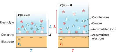 研究人员开发的新型温度计由三个简单的部分组成:电解质、电极和将两者分开的电介质材料。电解质/电介质界面积聚离子,而电介质/电极界面积聚电子。两者之间的电荷不平衡在电解质中形成了离子云。当温度变化时,离子云的厚度发生变化,并产生电压。电压对温度变化灵敏,但对器件的拉伸不敏感。