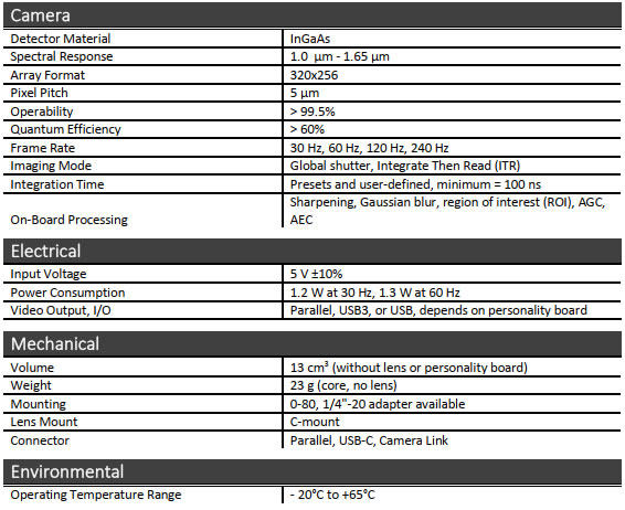 Phoenix QVGA短波红外相机的其他功能包括具有先积分后读取(ITR)功能的全局快门,以及具有预设和用户定义选项的最小100 ns积分时间。光谱响应范围从1.0 µm到1.65 µm,还提供Camera Link或USB-C输出以及一系列镜头,但需额外付费。