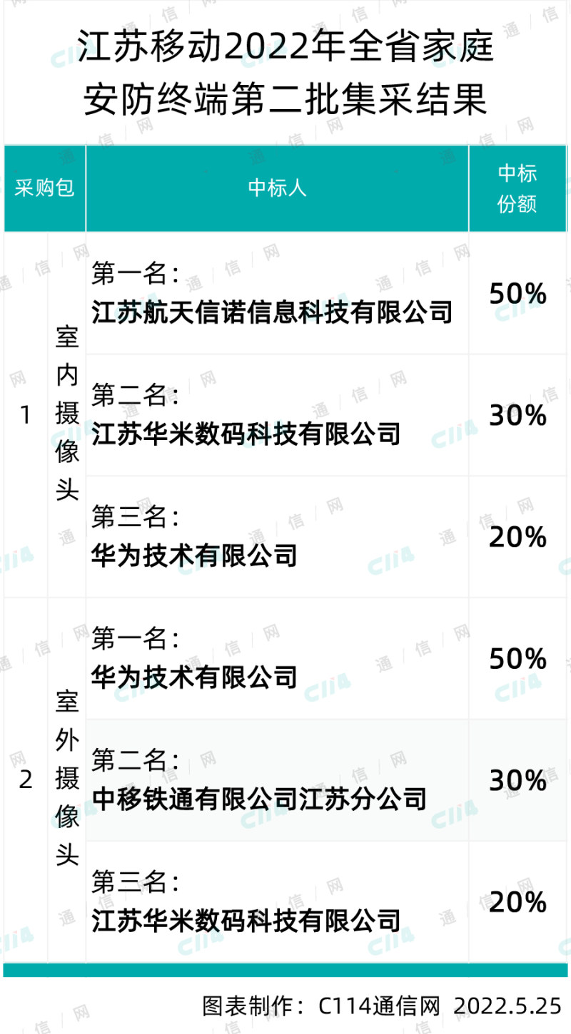 C114讯 5月25日消息(焦焦)从中国移动官网获悉,江苏移动今日公示2022年全省家庭安防终端第二批集采结果,华为、航天信诺、华米数码和江苏中移铁通4家中标。