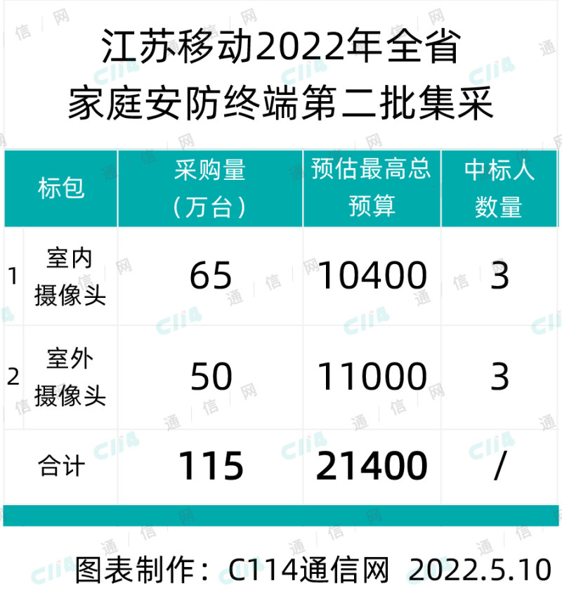 据此前江苏移动发布的采购公告显示,本次江苏移动需采购摄像头共计115万台,其中室内摄像头65万台,室外摄像头50万台。该项目预估预算总金额为21400万元(含税),其中室内摄像头预算10400万元(含税);室外摄像头预算11000万元(含税)。
