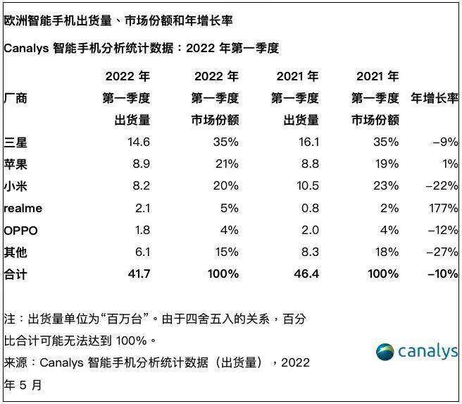 2022年第一季度,欧洲智能手机市场出货量排名前五的厂商分别为:三星、苹果、小米、realme、OPPO。