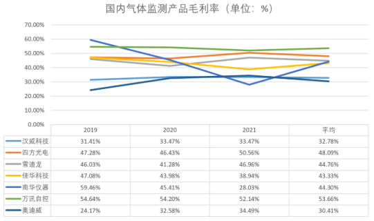 从利润来看,汉威科技和四方光电作为气体传感器的龙头,在近年来利润得到了很大的增长。同样保持着高利润的还有雪迪龙,而其盈利主体为环境监测系统产品。