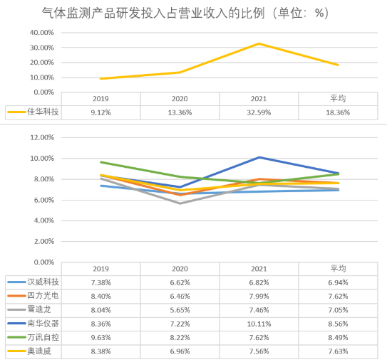 可以看到,各气体监测企业的平均毛利率都保持在40%左右,说明行业拥有一定的盈利空间,未来在这些企业获取更多业务做大规模后,相信毛利率还会有进一步的提升。在研发投入方面,企业也都保持在7-8%的高额研发投入,说明该行业还在探索期,企业都在不断加紧研发以获取技术优势。