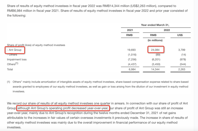 由于阿里巴巴延后一个季度在财报中计入来自蚂蚁的投资收益,一直以来阿里财报成为外界观察蚂蚁利润的窗口。本次财报中阿里表示,在蚂蚁集团2021年经营利润同比下降的情况下,其与蚂蚁集团有关的投资收益同比依然增加,主要是由于蚂蚁集团持有若干海外投资的公允价值增加。