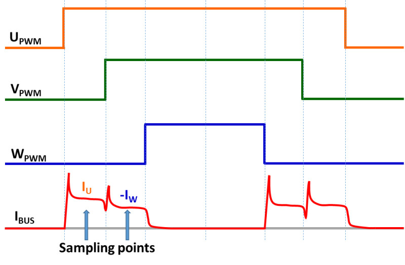 在电机控制应用中,必须实时感测电机的电流状态,以进行高速电流环控制运算,特别是在单电阻电流取样时,须在极短时间内(<1us)读取电流回授信号以避开噪声,如图4所示,以及在sensorless控制应用,还需要实时感测DC BUS电压或电机端电压,因此需要高速ADC外围支持。此外为精确获取高解析的电流与电压信息,12-bit ADC是兼顾解析与成本的合理选择。AT32 MCU具备取样速率达5.33MHz的12-bit ADC,并拥有24个外部通道设计,足可提供电机控制相关的信号取样需求。