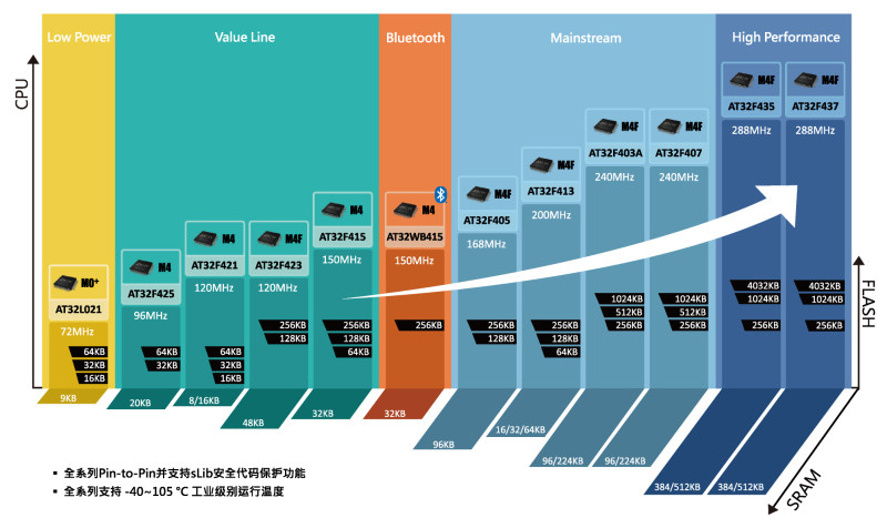 AT32 MCU具有多重的芯片安全防护措施,包含绝对性的读保护(RDP)、随机数Flash烧录,以及雅特力自行研发的sLib(security library)功能,可指定范围以密码保护特定程序区,例如上游方案商将核心算法保护后,可提供给下游客户做二次程序开发。对于外部扩展SPI NOR Flash通过MCU烧录此外扩Flash时,该区段程序与资料会被芯片内部硬件打乱数值加密,对MCU代码做了全面性防护。