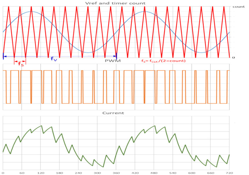 高速时钟频率同时也让脉波宽度调变PWM体现出高分辨率的优势,由于驱动器藉由脉波宽度调变输出脉波电压,以改变电机电流,故PWM分辨率决定了控制电机电压振幅的能力,而PWM频率越高则可提高电压相位的控制解析,并减少电机电流涟波,图2的示意图说明了PWM信号的分辨率和频率对电流的影响。但在相同频率下,PWM分辨率越高则PWM频率越低,因为两者的乘积是对比于系统频率,故高时钟频率可同时兼顾PWM分辨率与频率,特别是在数十万转的电机驱动应用上,因电机转速快电流频率高、电机线圈电感小,需要提供高频、高解析的PWM电压,方能使电机高效稳定运转。