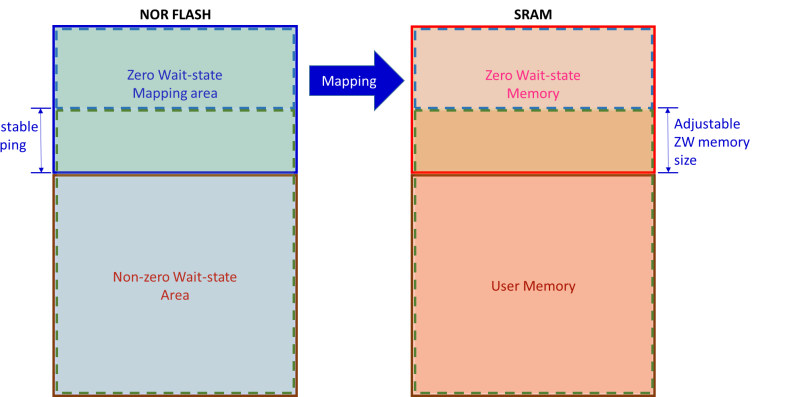 高主频MCU运算速度虽快,但若无高速存储器配合,整体执行效能会受限于Flash指令撷取速度,虽可将关键程序区段搬移至SRAM,但却会减少可运用的SRAM空间,且增加程序复杂度。AT32 MCU内建Flash弹性映射功能,如图3所示,MCU于启动时,自动将映射区域的Flash资料搬移至ZW(zero wait-state)记忆区块,最高可使用达512k byte零等待Flash。藉由Cortex-M4F内核、288MHz高主频与零等待Flash三者的完美配合,发挥MCU极致执行效能。此外针对高性价比的MCU系列,虽未设计零等待Flash,但雅特力科技特别优化其pre-fetch与catch buffer架构与运作机制,以确保在绝大部分执行状况下,等同于零等待Flash的执行效能。