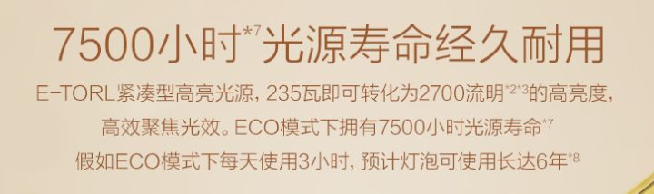 此外,比寿命短更直接的短板是,灯泡光衰也比想象中更加迅速,仅仅使用500小时,就只剩原始亮度的65%,节能低亮模式也只能保留75%。而500小时,按每天3~4小时观看来算,也就3到4个月。哪怕每天观看1小时,1年半后也妥妥光衰。