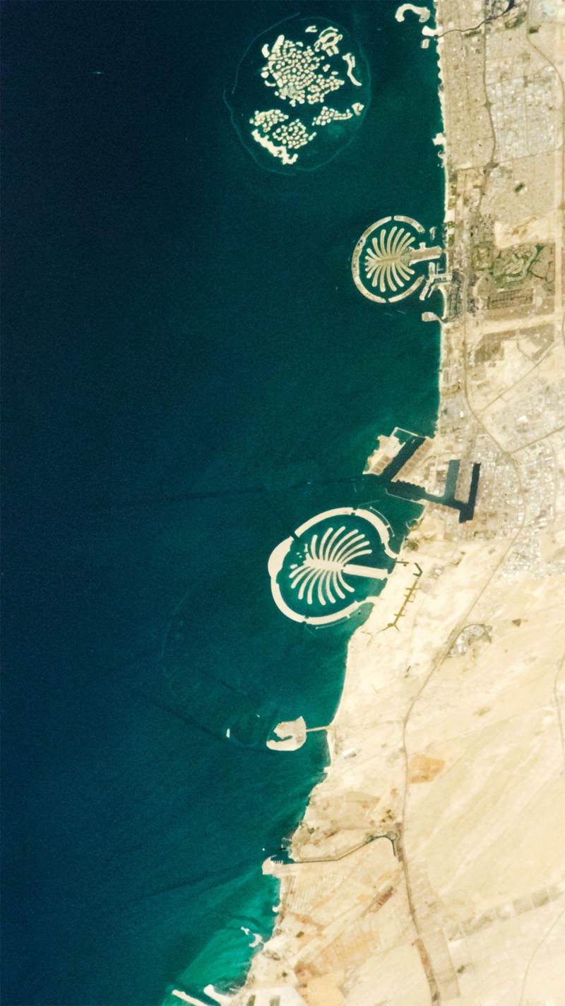 在这张由国际空间站的宇航员于2022年4月6日拍摄的照片中,一对由圆形风暴屏障包围的棕榈形岛屿(朱美拉棕榈岛和杰贝阿里棕榈岛)和一个设计成地球大陆地图的群岛格外引人注目。为了建造这些不寻常的海岸地貌,工人们从海底挖出沙子和淤泥,用船只和GPS定位技术搭配将其喷成所需的形状,并使用一种称为vibroflot的建筑设备来混合石头,使新的填海岛屿变得稳固。