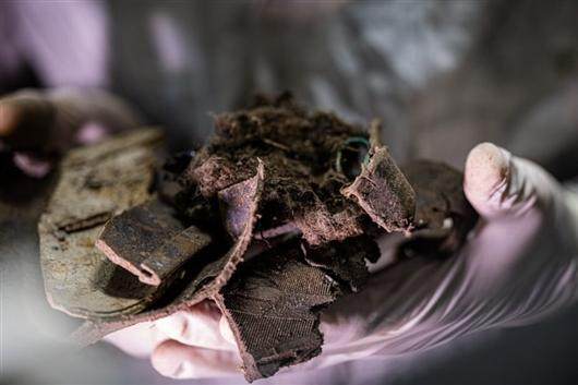 作者Kevin Wyss拿着报废的汽车废塑料,这些塑料被回收升级为石墨烯。这些报废塑料来自垃圾填埋场,使用前未经任何清洗或净化。图片来自莱斯大学