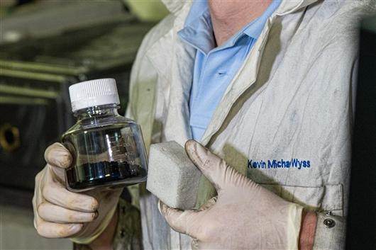 作者Kevin Wyss手拿一瓶废塑料制成的石墨烯和一块福特汽车公司实验用的石墨烯加固的聚合物。图片来自莱斯大学