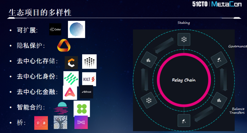 基于Polkadot开发环境的灵活性,整个生态的项目多样性也迥异于其他区块链生态。不同的开发团队得以在其中开发更加多样化的产品和系统,包括增加可扩展性、隐私保护、去中心化存储、去中心化身份以及各种各样的桥,进而方便不同的应用系统,获取更好的数据和资产交互,完善整个生态。