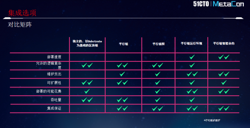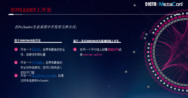 需要注意的是,定制化区块链和智能合约直接部署,两者并非直接的竞争关系,因为在Polkadot生态里这些都可以实现。既可以开发一个独立的Substrate链,也可以开发一个平行链接入Polkadot,甚至是开发一个轻量级平行线程定期地接入Polkadot,把对应数据共享在Polkadot生态里。与此同时,已经运行的一些平行链支持像Solidity、WASM这样的智能合约系统,开发者也可以在上边部署智能合约。