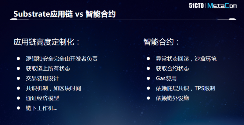以智能合约部署为例,在已有的区块链系统上搭建Substrate应用链有很多优势。通常来说,针对部分资产操作,直接去开发Solidity智能合约应用是相对方便的,但受限于其已有的操作码以及其本身的各种约束,无法完成更高程度的定制化操作。而基于Substrate运行环境构建的应用链却可以实现高度定制化。比如逻辑和安全完全由开发者负责,可以获取链上所有状态,进行链上链下的互操作,以便更好地支持某些联盟链或者私有链场景。