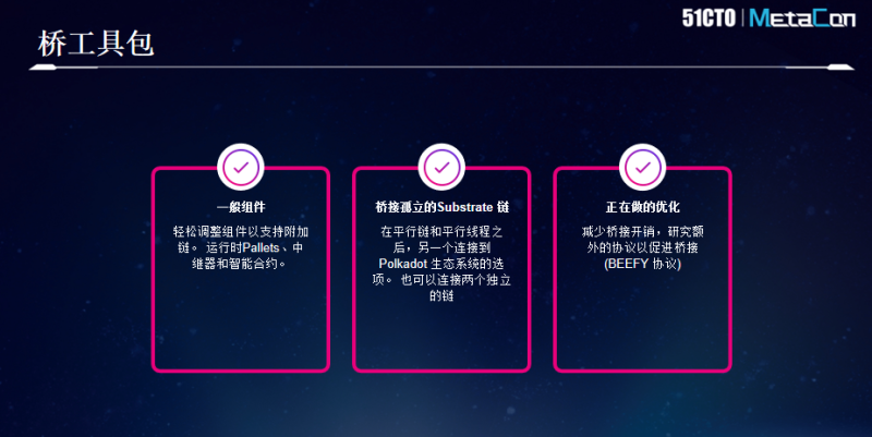 此外,我们还开发了各种各样的桥工具包,更好地打通了Polkadot本身生态以及Polkadot外已有的异构区块链之间的消息传递以及资产转移的问题。